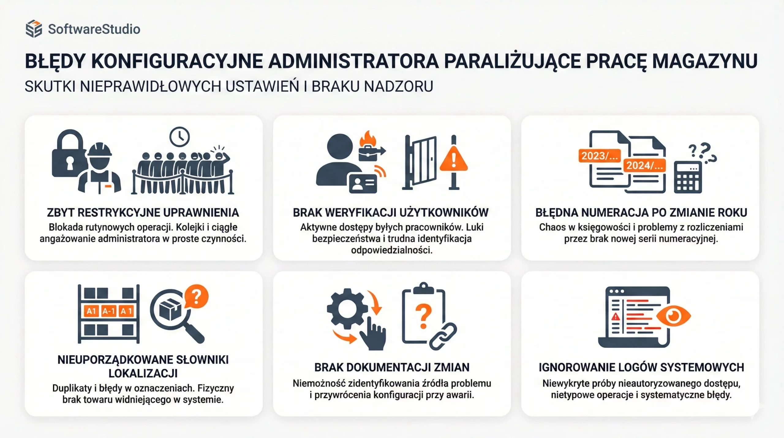 - Zbyt restrykcyjne uprawnienia blokujące rutynowe operacje – nadmierne ograniczenie praw dostępu do podstawowych funkcji sprawia, że magazynierzy nie mogą samodzielnie wykonać wydania czy zwrotu, co generuje kolejki przy okienku i wymusza ciągłe angażowanie administratora w trywialne czynności operacyjne