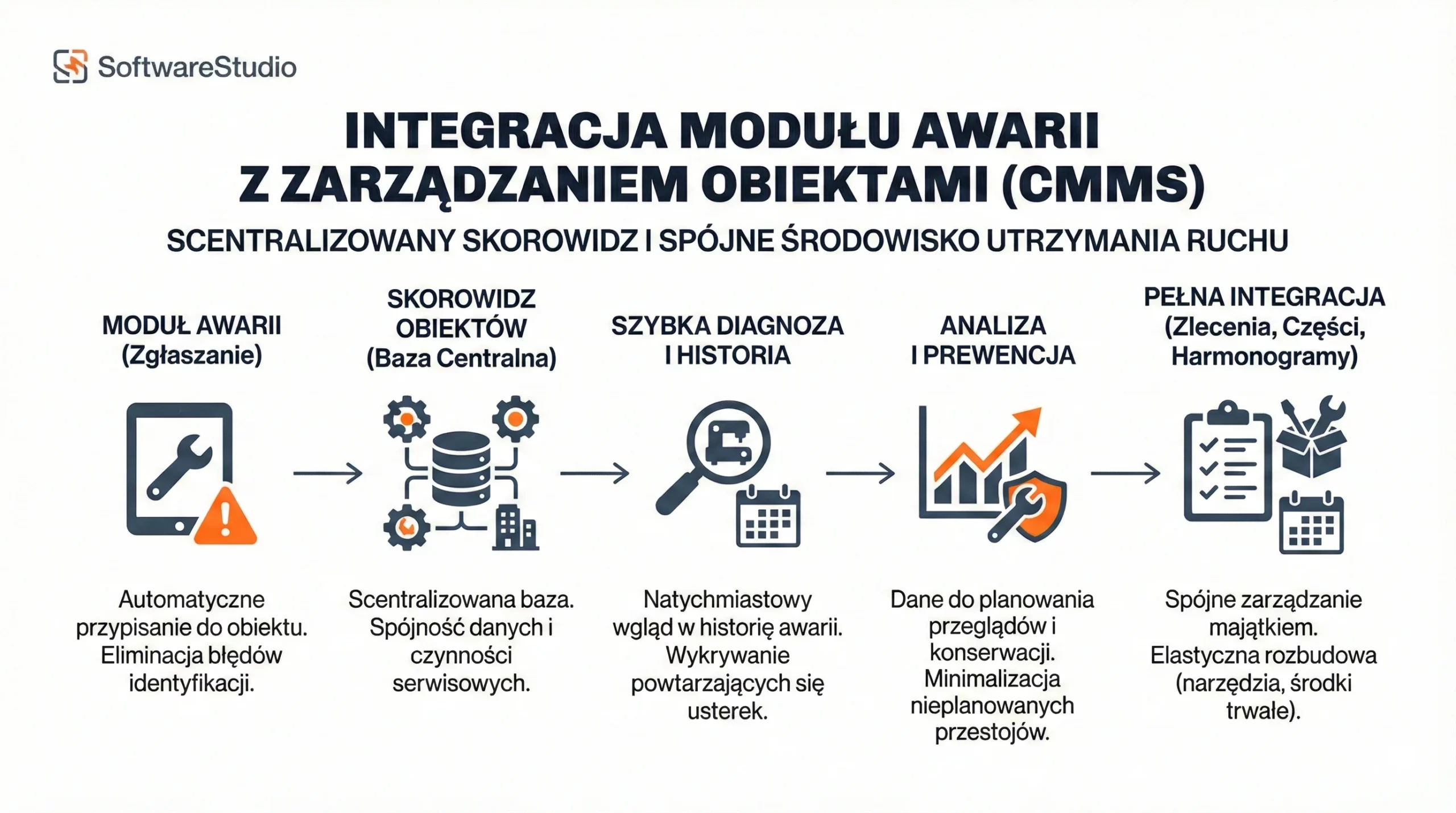 Wdrażamy moduł awarii jako integralną część rozbudowanego ekosystemu, co pozwala na pełne powiązanie zgłoszeń z infrastrukturą techniczną i maszynami.