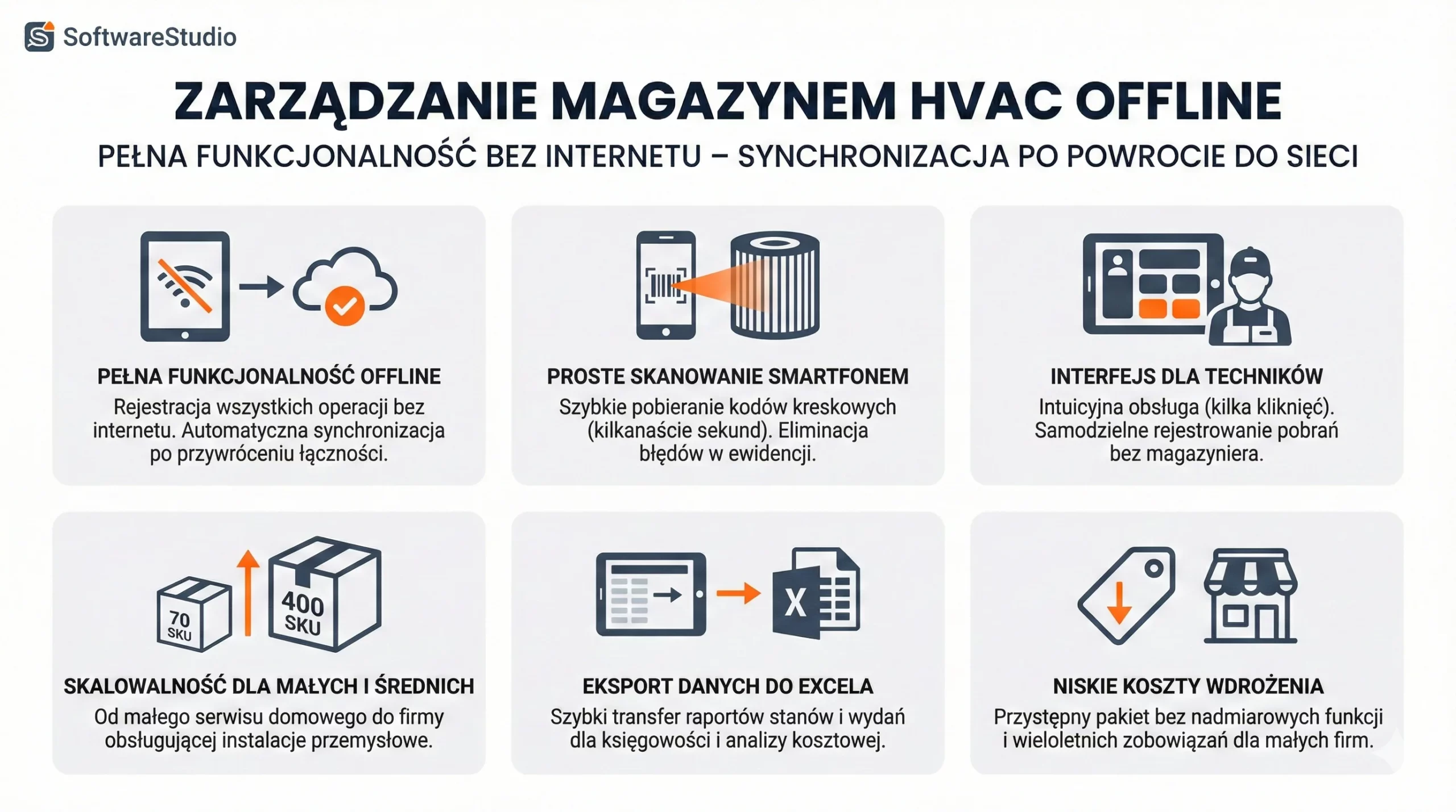Serwisy HVAC często lokalizują magazyny części zamiennych w halach, piwnicach lub obiektach logistycznych pozbawionych stabilnego dostępu do sieci. Tradycyjne systemy magazynowe wymagające ciągłego połączenia z chmurą stają się bezużyteczne w takich warunkach, zmuszając firmy do prowadzenia chaotycznej ewidencji w zeszytach lub w ogóle rezygnacji z kontroli stanów. Nowoczesne rozwiązanie offline pozwala prowadzić pełną ewidencję z wykorzystaniem skanowania kodów kreskowych nawet gdy internet jest niedostępny, a synchronizacja danych następuje automatycznie po przywróceniu łączności.
